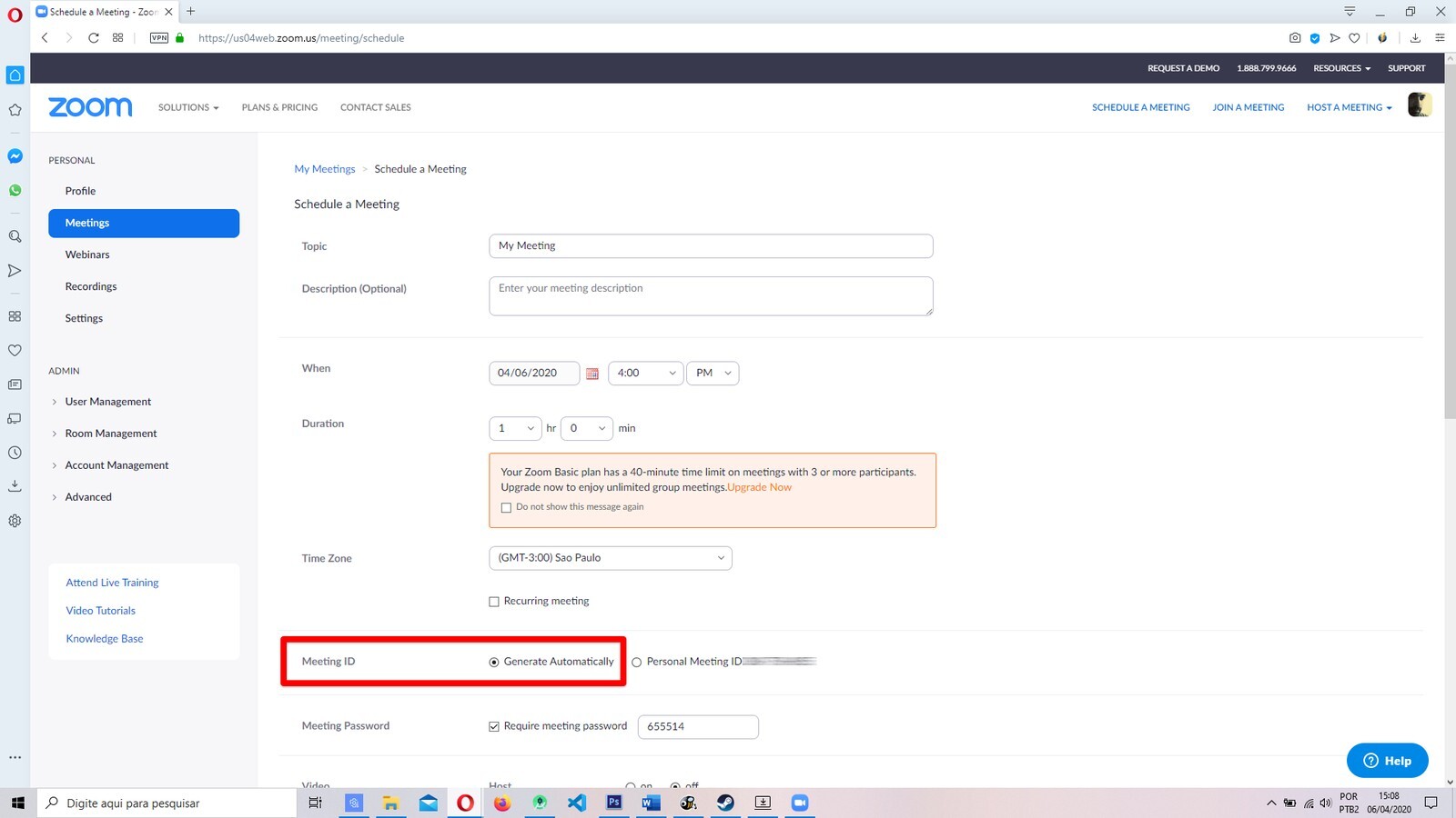 A maneira de evitar esse tipo de situação é usar um PMI aleatório, gerado pelo próprio Zoom para uso único, e que difere do seu PMI pessoal. Isso é possível apenas por meio do agendamento de uma reunião. Em “Schedule a Meeting”, basta marcar “Generated Automatically” na opção “Meeting ID”. Dessa forma, seu PMI pessoal não será usado na criação da sala.